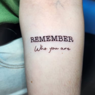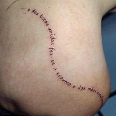 Tatuagens em escrita são uma forma elegante e significativa de eternizar palavras que marcam a vida de alguém. Frases inspiradoras, trechos de músicas, poesias, nomes ou até assinaturas manuscritas podem ser tatuadas em diferentes estilos, desde fontes minimalistas e delicadas até caligrafias ornamentadas e expressivas. Elas podem ser podem ser feitas sozinhas, destacando a força das palavras, ou acompanhadas de desenhos que complementam o significado.
