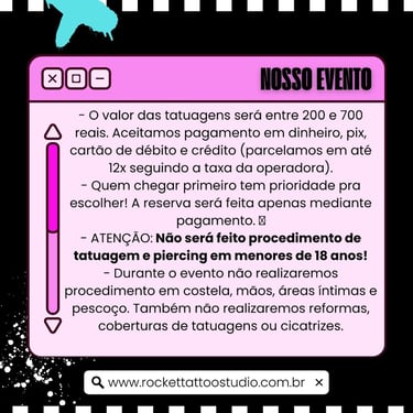 Durante o fim de semana dos dias 06 e 07 de dezembro, o Rocket Tattoo Studio vai se transformar em um verdadeiro portal do tempo, com flash tattoos exclusivas, criadas especialmente para celebrar tudo aquilo que fez parte da nossa infância e adolescência: cartoons clássicos, videogames retrô, filmes e séries inesquecíveis, livros e animes icônicos! É o momento perfeito para eternizar na pele o ícone da cultura pop que marcou sua história.